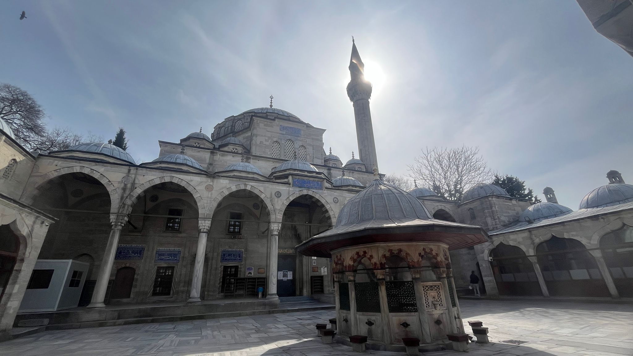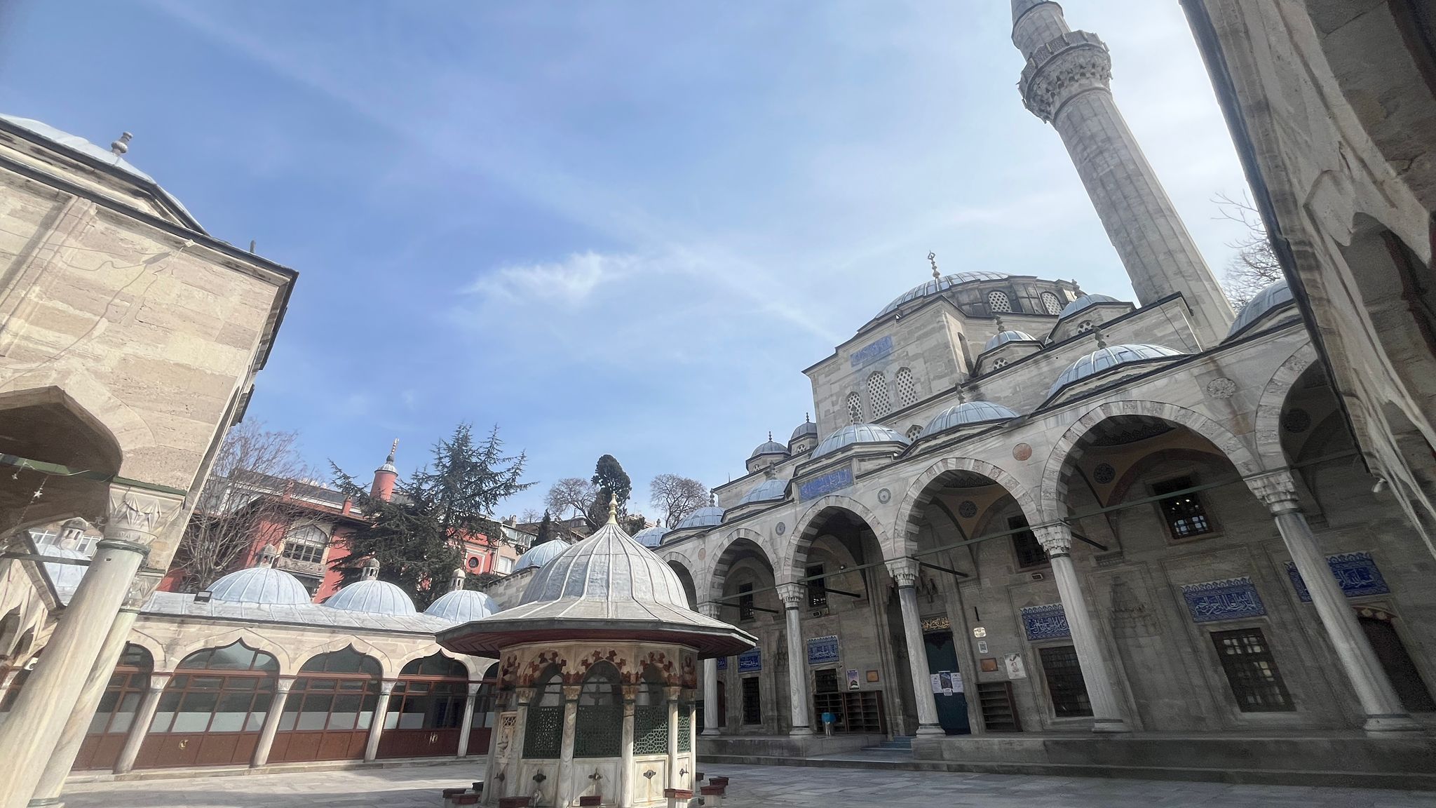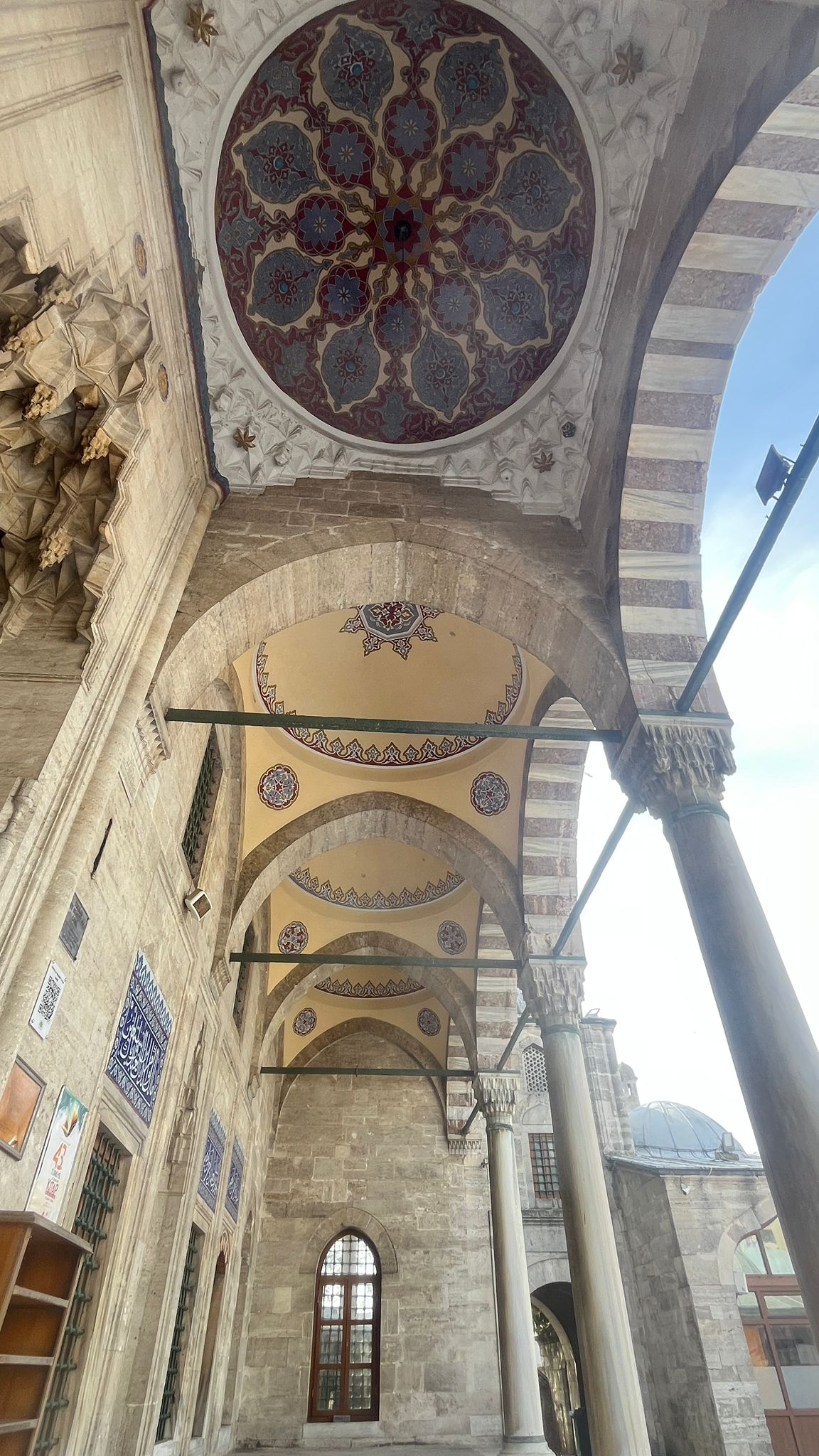 Caminin avlusu, sütunlu medrese odalarıyla çevrilidir. Avlunun ortasında sekizgen planlı, zarif bir şadırvan yer alır. Caminin duvarları kesme taştan inşa edilmiş olup, üst yapı kurşunla kaplıdır. İçeri adım attığım anda sanki taş duvarların arasında değil de, beni tanıyan sevimli,sıcacık ve samimi ; insanı ezmeyen , aksine içine alıp ve sarmalayan bir yapının içinde buldum kendimi..