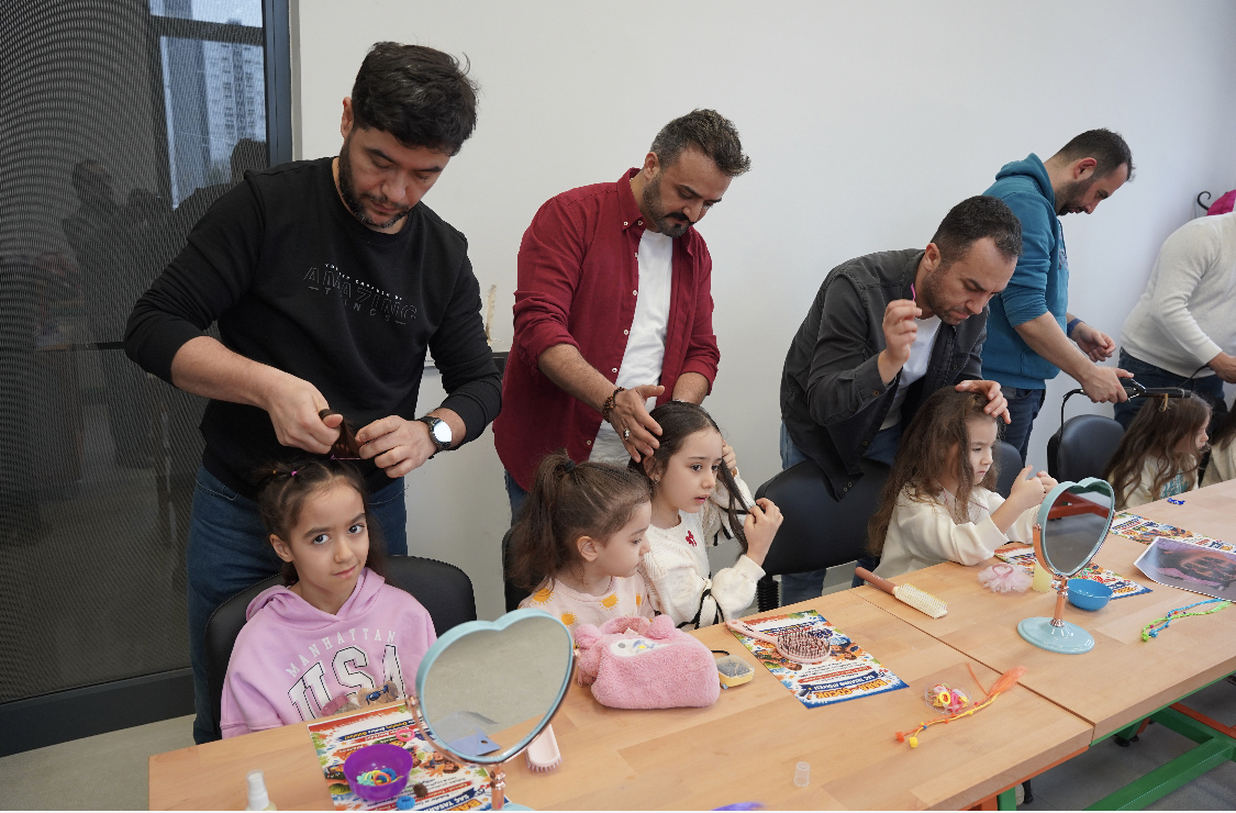 Tuzla Belediyesi Kadın ve Aile Hizmetleri Müdürlüğü tarafından organize edilen ve “Sevgiyle Şekilleniyor” sloganıyla gerçekleştirilen atölyede, babalar kız ve erkek çocuklarının saçlarını renkli tokalar, çıtçıtlar, taraklar ve renkli saç spreyleri kullanarak şekillendirdi. Atölyede ayrıca kız çocukları için taç tasarımı ve boncuklarla süslemeler yapıldı.