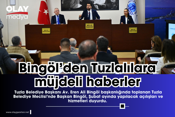 Tuzla Belediye Başkanı Av. Eren Ali Bingöl başkanlığında toplanan Tuzla Belediye Meclisi’nde Başkan Bingöl, Şubat ayında yapılacak açılışları ve hizmetleri duyurdu. Başkan Bingöl; Muhammet Tekin Ağırman Parkı, Organik Çarşı, Tuzla Tarihi Kitabı, Ayyıldız Sosyal Tesisi’nin yeniden hizmete açılması, hal inşaatı ve hale yapılacak yeni itfaiye istasyonu hakkında da bilgiler verdi.