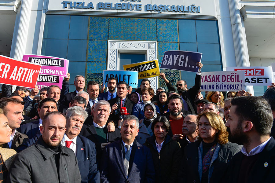 TUZLA Belediyesi Meclis üyesi Türel Ağyol'un sosyal medyada, CHP Genel Başkanı Kemal Kılıçdaroğlu ile İYİ Parti Genel Başkanı Meral Akşener'in fotoğrafına yaptığı yorumdan sonra CHP ve İYİ Parti üyeleri, Tuzla Belediyesi'nin önünde toplanarak protesto gösterisi düzenledi.