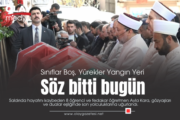 Kahramanmaraş, Ayser Çalık Ortaokulu'nda gerçekleşen ve tüm ülkeyi yasa boğan silahlı saldırının ardından bugün en acı günlerinden birini yaşıyor. Saldırıda hayatını kaybeden 8 öğrenci ve fedakar öğretmen Ayla Kara, gözyaşları ve dualar eşliğinde son yolculuklarına uğurlandı.