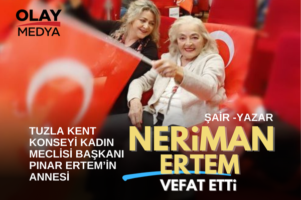 Tuzla Kent Konseyi Kadın Meclisi Başkanı Pınar Ertem'in annesi Şair-Yazar Neriman Ertem vefat etti. Cenazesi bugün öğlen namazına müteakiben Tuzla istasyon Mahallesi'ndeki Çiçekçiler Camisi'nden kaldırılacak. OLAY GAZETESİ olarak Merhumeye Allah'tan rahmet, kederli ailesi, dost ve sevenlerine başsağlığı dileriz.