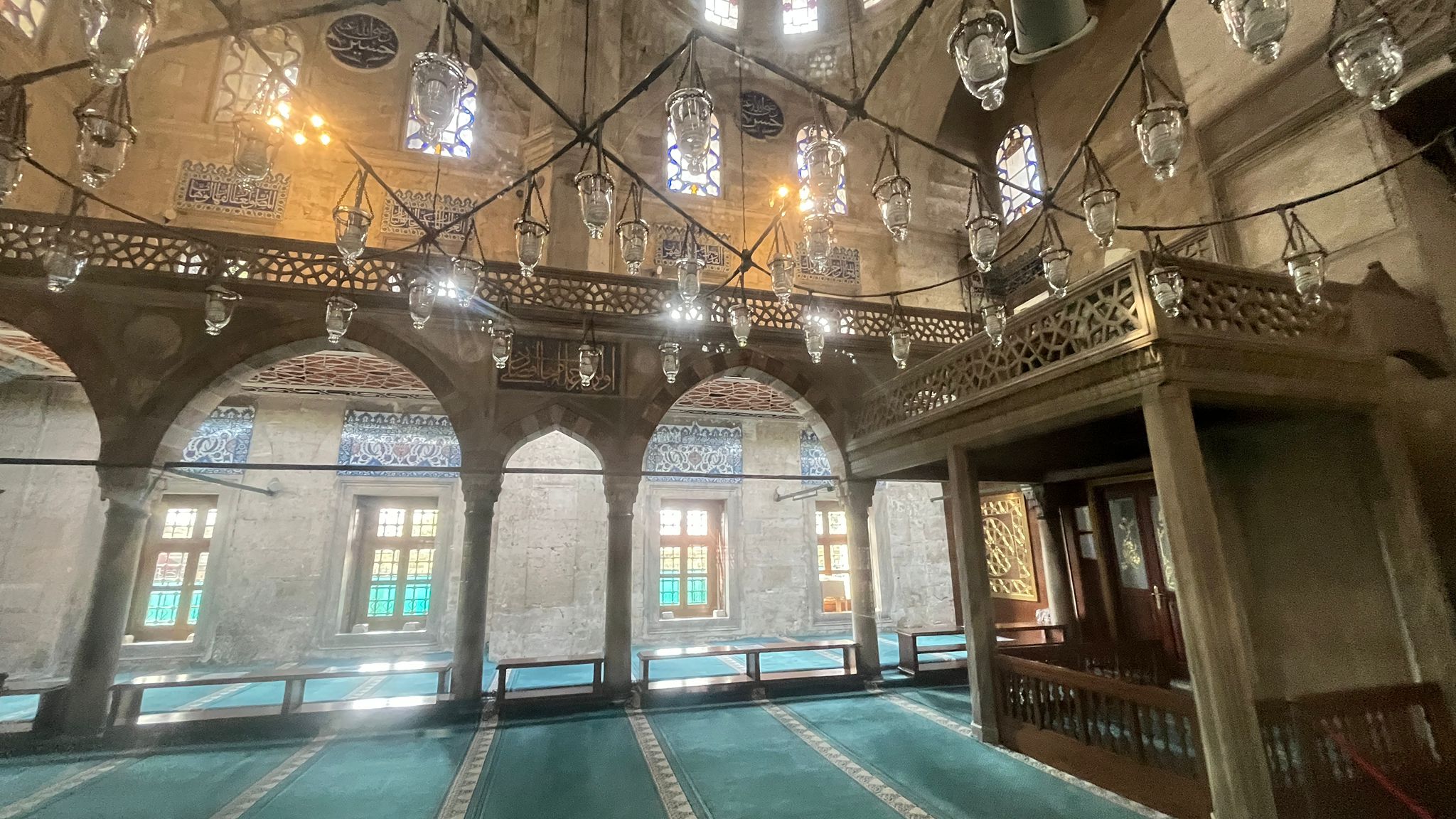 Adeta hakiki bir mücevher dükkânına girmiş gibi; her köşesi ince işçilikle parlayan, her detayı ayrı bir zarafet taşıyan eser.. İznik çinilerinin ve orijinal kalem işlerinin en zarif örnekleri kullanılmış, lacivertin ve turkuazın renklerinin buluştuğu, lale ve zarif yaprak motifleriyle ışıl ışıl parlayan İznik çinilerine bakıyorum; her biri içimde ışıl ışıl parlıyor sanki . . Ayrıca minaresi ve şerefesi, zarif süslemeleri ve incelikle işlenmiş korkuluklarıyla adeta göz kamaştıran bir güzellik sunar.